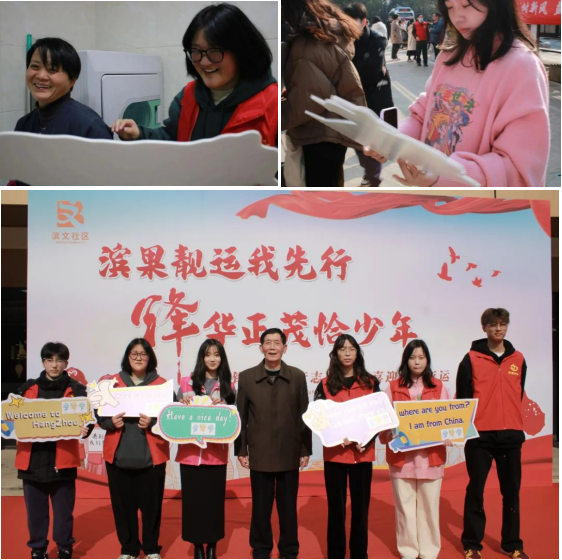 本次志愿服务以喜迎亚运为背景,志愿者们带着教具教小朋友们学习了一些基础的英语对话:“How are you?……”“Were are you from?I am from Hangzhou.”。一抹抹“志愿红”的身影,穿梭在活动场地,形成一道独特的风景线。