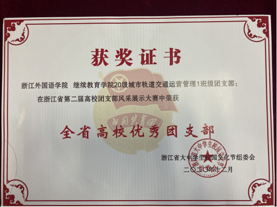 公司2020级城市轨道交通运营管理1班团支部在浙江省第二届高校团支部风采展示大赛中荣获“全省高校优秀团支部”称号。